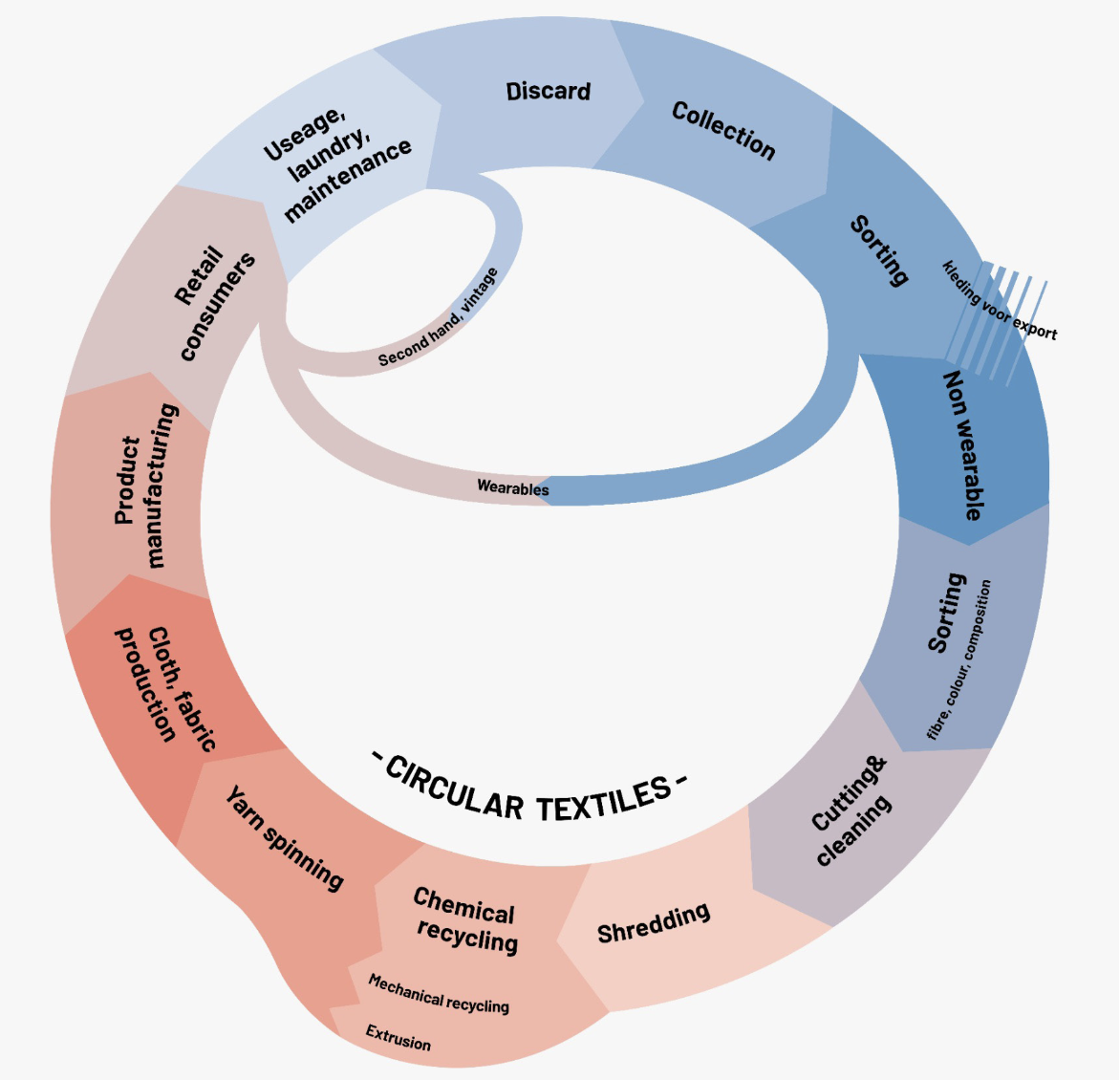 As a member of the Amsterdam Reflow team at Waag’s TextileLab Amsterdam, our primary focus was to evaluate the circularity of textiles used within the city and outline a potential roadmap for the future. Throughout the project, the team developed the “Circular Textile Wheel,” an infographic outlining the 16 stages of circular textiles. Given the challenge of recycling garments and their lack of biodegradability, extending the lifespan of clothing emerges as a key sustainable choice.